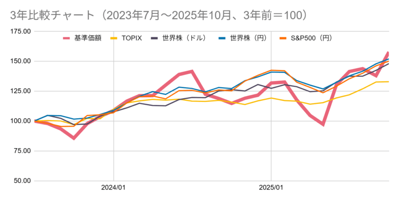 ただ、これまでの動きを見る限り、世界株平均とほぼ同程度のパフォーマンスとなっています。