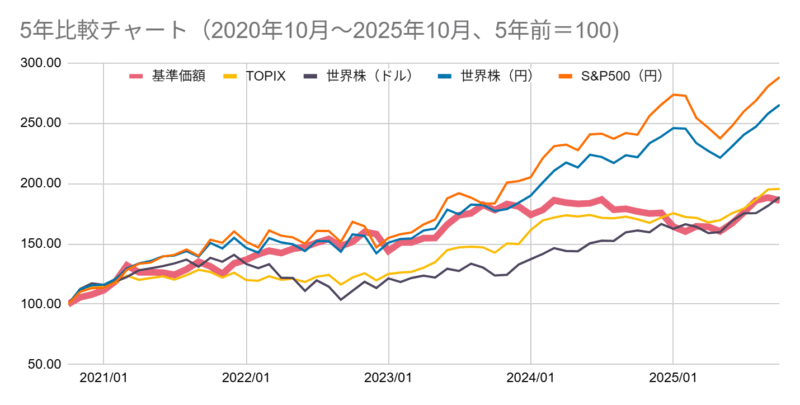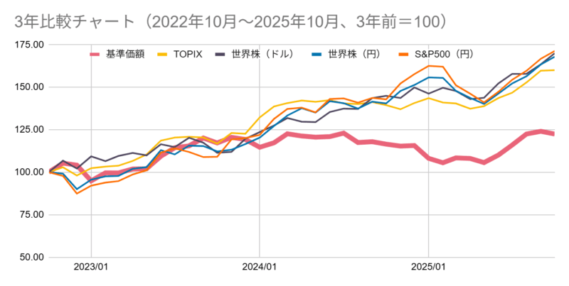2021年から現在に至る3年間を見ると、日経平均に比べて50%ほど勝っており、同期間の世界株平均に比べても10%以上上回っています。
