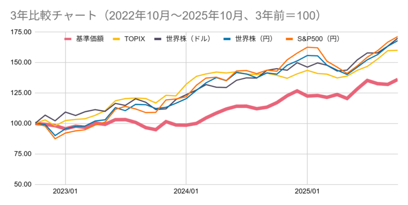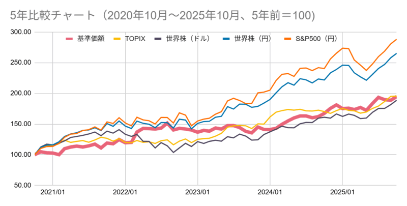 さらに、円安メリットだけで値上がりしている多くのファンドと違い、しっかりと円ベースでも世界株平均についていっています。