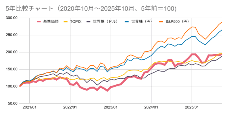 パフォーマンスを見てみると、為替を考慮した世界株や日経平均にも劣っています。本来ESG投資は社会的貢献だけでなく、投資パフォーマンスも良いとされているはずなのですが。