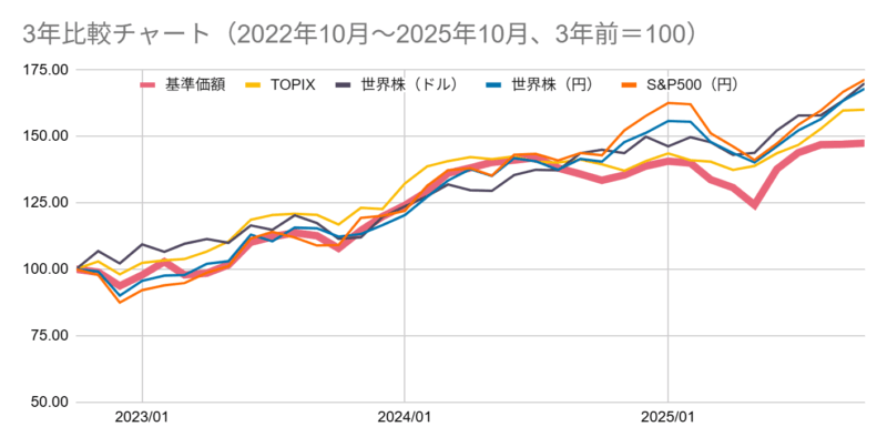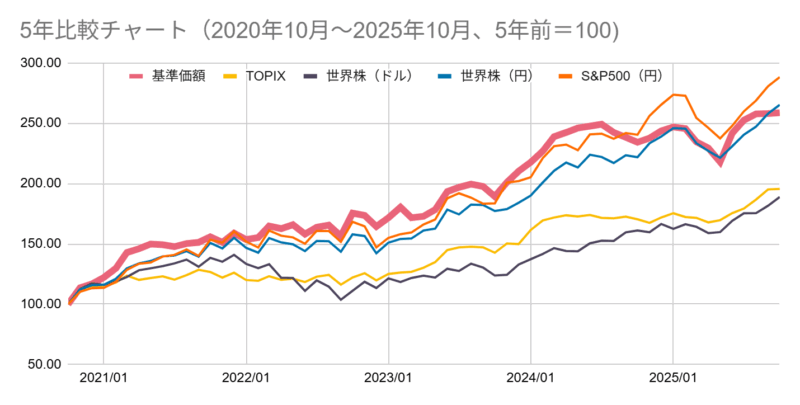 パフォーマンスを見ると、円ベースの世界株平均をも大きく上回り、かなり良い成績です。しかも、基準価額のブレ(リスク)もそれほど大きくなく、シャープレシオも1.6と、かなり良い運用ができている印象です。