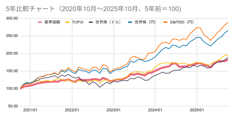 基本の配分比率は株式50%、債券50%ですが、日経平均や世界株指数を上回った成果がでています。
