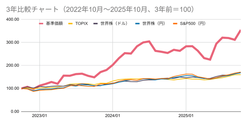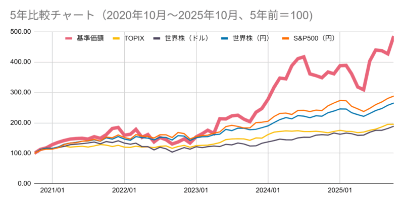 過去5年では、好調であったS&P500指数(円換算)と比較しても200%ほど上回っており、アクティブファンドの中でも一部レバレッジ系運用を行うファンドを除けばダントツで上昇しているファンドです。