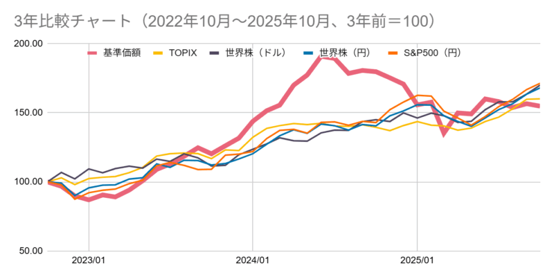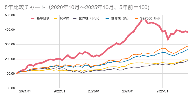 世界株平均はもちろんのこと、インドのSENSEX指数を円換算したものや、米国S&P500指数よりも大きく上回る数字です。