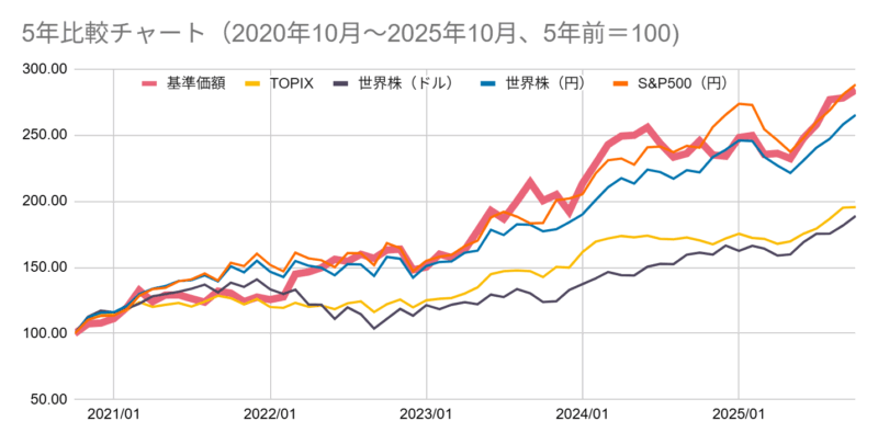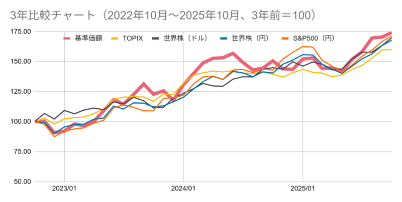 過去5年や3年で見ると、TOPIXの動きを大きく上回り、更には世界株平均にも並ぶ好パフォーマンスとなっています。