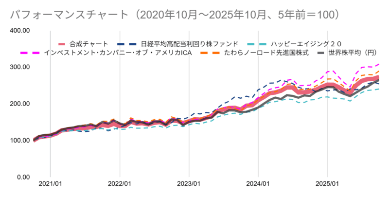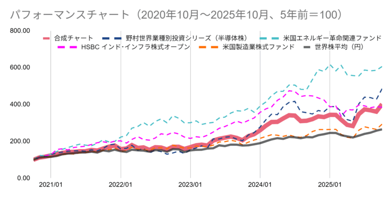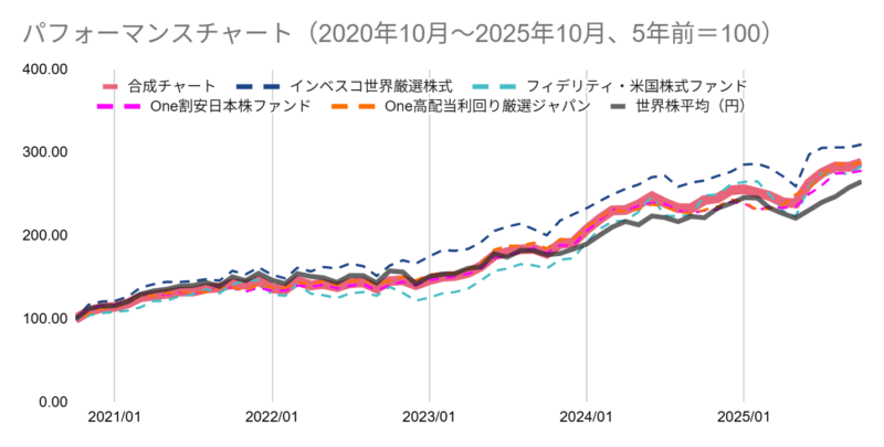 各ファンドを均等額投資した場合の過去シミュレーション。