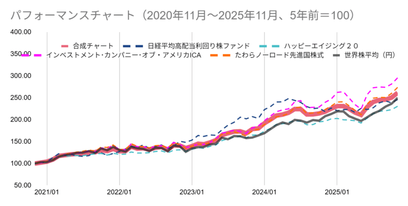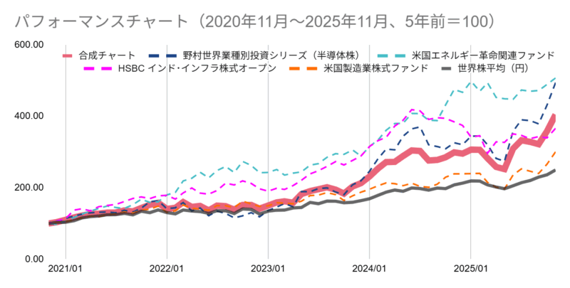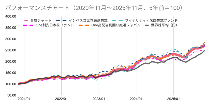 各ファンドを均等額投資した場合の過去シミュレーション。